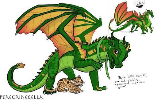 Description} Fern is a dark green female with a lighter underbody, and pale green eyes. She has golden-orange spots along her sides, on her legs, and on her tail and her wings are golden-orange and fade up into a golden-yellow.
