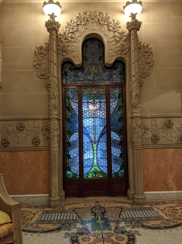 The sprog went to visit Casa Navas, in Reus in Catalonia over the Easter holiday as I'd asked him if he could take a photo of it with the light shining through the stained glass. he and his girlfriend went on a guided tour of the house (in Spanish). When they asked about the door they were met with bafflement. Eventually it dawned on the guide that this was because the door was always open and so the glass in the door was never seen.