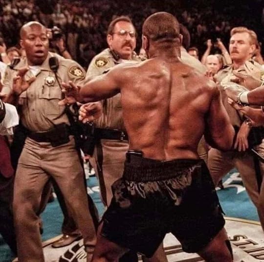 Fishface | 19044 comments Police surrounding Mike Tyson who had just bitten off Evander Holyfield's ear in a storied 1996 prizefight: