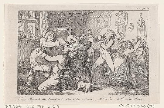 I mentioned before that Thomas Rowlandson did a series of etchings for The History of Tom Jones, a Foundling. He was a famous contemporary satirist and caricaturist, who made a lot of cartoons: usually social observation and the politics of the time. This one, I think, might be from Book 9 - the fight in the Inn: