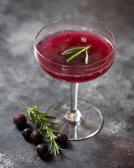 3. Strain into the chilled glasses. Garnish with the rosemary sprigs and drop the extra frozen berries into the bottom.