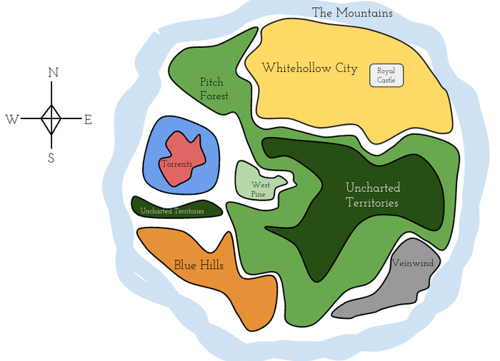 Whitehollow City is the largest city in the kingdom, starting in the far northeast at the foot of the mountains and ending around the middle of the kingdom. It's home to a few million people from all sorts of backgrounds and species, and it's where the royal castle is located. Whitehollow's main industry is luxury items and trading, and shipments are constantly flowing in and out from nations beyond the mountain range.