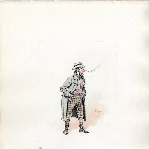 The gentlemanly murderer of his wife, Rigaurd (alias Blandois) attaches himself to the Gowans when they are honeymooning in Italy, probably with the intention of defrauding them and the other travelling English family, the Dorrits. In his own mind, he is a cosmopolitan lady-killer with exaggerated courtly French manners; Phiz and later illustrators imbue him with more than a whiff of Satanic sulfur, emphasized in his smoking cigarettes, and in the Mahoney illustration set in the Alps by his proximity to the smoke from the nearby convent.