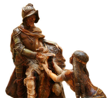 Statue of Hernando de Soto receiving a gift from a Caddo Indian maiden; photo by madame_urushiol on Flickr (noncommercial use permitted with attribution / no derivative works)