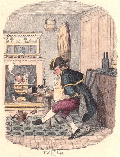 I really enjoyed all the various illustrations for this chapter. I particularly like Pailthorpe's illustration of Mr. Bumble dancing round the table. I notice in Cruikshank's illustration, it appears Mrs. Coney has a portrait of herself on the wall. Is that an indication of vanity? Or was that a normal thing to hang on one's wall? I expected her to have a picture of her dear husband hanging on the wall, perhaps this indicates she doesn't miss him as much as she says?