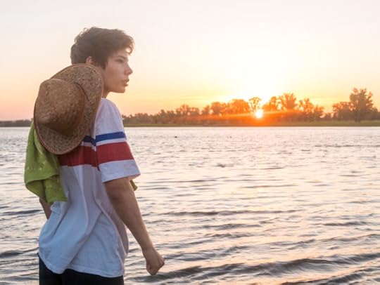 Then this year… he swam over to the dock at sunset our first day in the cabin, and hung off the post, looking up at me. His hair lay plastered to his forehead and neck, long and unstyled, kissed near-white on top by the sun, with darker hints underneath. His skin was the bronzy-brown that could be a tan, or some kind of ancestry, but his eyes were a pale, pale gray, like the water in winter. He was younger than I'd thought from the shape of his muscles last year, maybe as young as me. Maybe a year or two older.