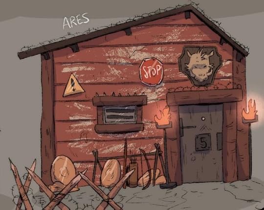 The outside of the cabin is scruffily painted with an angry red color, has barbed wire lining the roof, and a stuffed boar's head on the doorway. The eyes of the boar seem to stare at whoever is walking by. There are also live landmines surrounding the entrance.