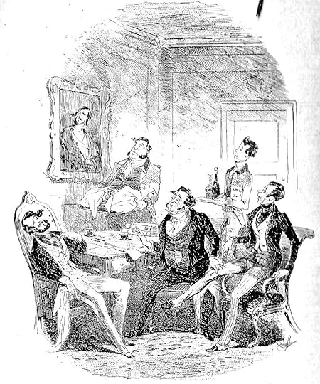 The Browne illustration certainly portrays the luxury of Tigg and his group. They all look so self-satisfied. They all look to their ‘leader’ whose portrait is on the wall. Earlier, we have seen how Pecksniff enjoys surrounding himself with his own image in both paint and a bust of himself.