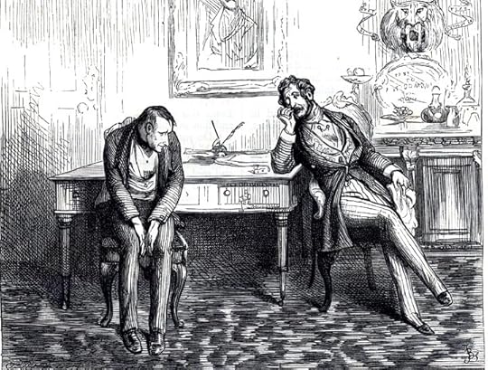 Mr. Tigg asks Jonas if he recognises him, and says that they had met previously through Mr. Pecksniff. Jonas is put off by Mr. Tigg’s association with Chevy Slyme, but Mr. Tigg convinces him that he has parted ways with Mr. Slyme and as he can see for himself, has become very successful.