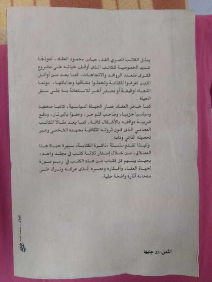 * Description: يمثل الكاتب المصري الفذ عباس محمود العقاد، نموذجًا شديد الخصوصية للكاتب الذي أوقف حياته على مشروع فكري متعدد الروافد والاتجاهات، كما يعد من أوائل الذين تفرغوا للكتابة وتحملوا مشاقها وعذاباتها، دونما التجاء لوظيفة أو مصدر آخر للاستعانة به على سبل الحياة.