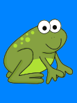 This frog is a clipart style graphic with a green frog with large white eyes set against a plain blue background. Although it's a cartoon image, the body shape is moderately representative of what a frog looks like, apart from the face.