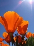 This one shows a few golden poppies, though they actually look more orange than golden! The photo is shot as if the camera was close to ground level looking up towards the flowers. There is a bright blue sky in the background, with a lens flare effect for the sun.