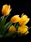 This pic shows a small bunch of yellow tulips with some of the green stems and foliage showing. They are leaning towards the right against a plain black background.