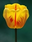 This image shows a single yellow tulip with some red markings on the petals. It's set against a blurred dark green background. The flower mostly fills the pic with a small amount of the stem showing.
