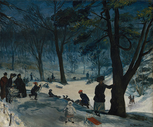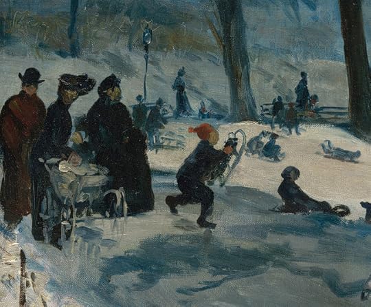 Glackens portrays a group of well-behaved children sledding down a gentle slope in New York's Central Park under the watchful eyes of adults who dot the perimeter of a snowy knoll. The children are warmly dressed and the adults are fashionably clothed, signaling that this is a story of middle-class recreation. Despite their nominal commitment to telling the unvarnished truth about modern life and urban hardship, Glackens and other Ashcan artists viewed their world through rose-colored glasses, presenting the city euphemistically and, as here, depicting people at leisure in quasi-rural surroundings rather than in their overcrowded home neighborhoods.