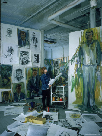 Elaine de Kooning working on JFK in her Manhattan studio, 1964