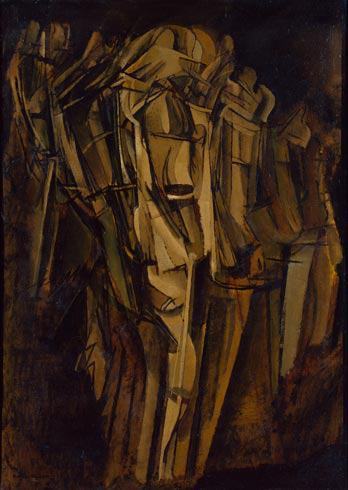 Duchamp’s primary concern in this painting is the depiction of two movements, that of the train in which we observe the young man smoking and that of the lurching figure itself. The forward motion of the train is suggested by the multiplication of the lines and volumes of the figure, a semitransparent form through which we can see windows, themselves transparent and presumably presenting a blurred, “moving” landscape. The independent sideways motion of the figure is represented by a directionally contrary series of repetitions. These two series of replications suggest the multiple images of chronophotography, which Duchamp acknowledged as an influence, and the related ideas of the Italian Futurists, of which he was at least aware by this time. Here he uses the device not only to illustrate movement, but also to integrate the young man with his murky surroundings, which with his swaying, drooping pose contribute to the air of melancholy. Shortly after the execution of this and similar works, Duchamp lost interest in Cubism and developed his eccentric vocabulary of mechanomorphic elements that foreshadowed aspects of Dada.