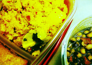 For lunch today:homemade - jalapeno wheat/cornbread, couscous w/ turmeric, pine nuts, coriander, fresh cilantro, chili pepper, red onion, mustard seed, and lemon & lime wedges(I kinda went with it... inspired by Indian biryani), and purple hull peas w/ vidalia onion & ham. :)