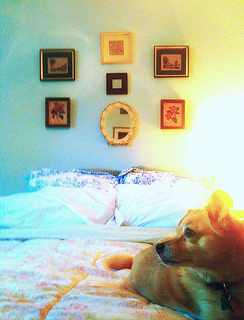 :) And again with Robby (this time it's mostly clean, but it's before I got the cross stitching above the bed, so it looks a bit different)