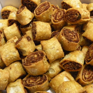 Lol? That isn't meat, the dark stuff is a blend of spices. It's called 'bakarwadi' I don't know what that is supposed to mean, but I love it.