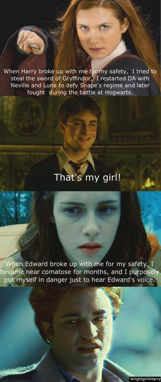 Amanda I think Meyer makes it seem like all women need to be rescued - a very old fashioned fairytale way of thinking. I really really dislike that factor. Without Edward around Bella is just pathetic. And believe me I am saying this as a fan of the series. Compare it to JK Rowling's female characters. They are strong and independent and smart: Hermione, Ginny, McGonagall, etc.