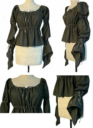 Clothing Style: wears a long black cloak her dress a deep forest green