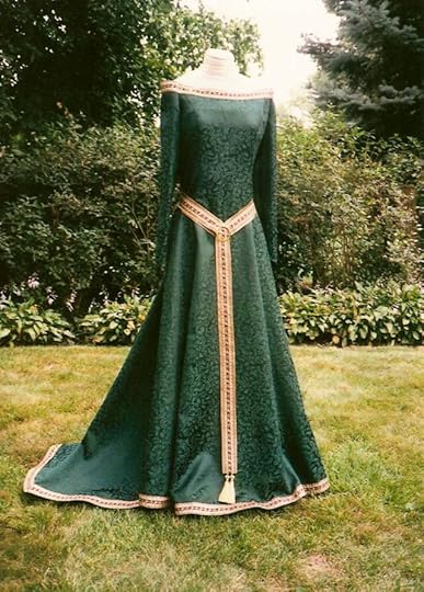 She wears many dresses in rich greens, reds and blues when she is attending dinners and walking around court with her maids.