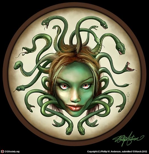 Her shield. It may not seem scary now, but in battle, the mouth will open to show pointy yellow teeth in a horrible snarl. The eyes will glow red, and it will seem as if she is hissing at you. If Gem is so inclined, it can actually turn one to stone.