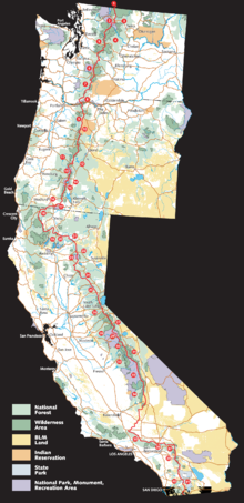The Pacific Crest Trail is 2,663 mi (4,286 km) long[1] and ranges in elevation from just above sea level at the Oregon-Washington border to 13,153 feet (4,009 m)[5] at Forester Pass in the Sierra Nevada. The route passes through 25 national forests and 7 national parks.[7