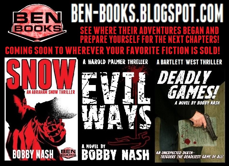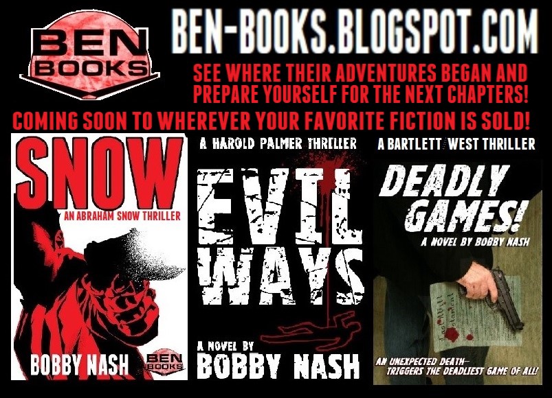Now's the time to catch up on SNOW (Snow Falls, Snow Storm, Snow Drive, Snow Trapped, and the Snow Series 1, Vol. 1 collection), Evil Ways, and Deadly Games! before their stories continue in 2019. Learn more about these titles and more at http://ben-books.blogspot.com & www.bobbynash.com. All titles are available in paperback and Kindle at Amazon, Barnes and Noble, and wherever your favorite thrillers are sold. You can also read them FREE with your Kindle Unlimited subscription or by joining the $5 or higher tier at www.patreon.com/bobbynash.