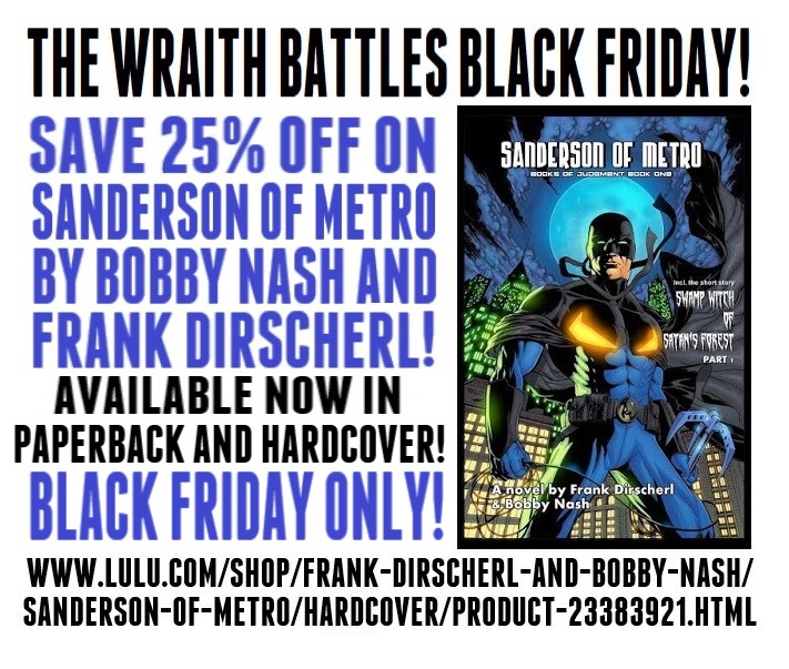 BLACK FRIDAY SALE! Grab your very own copy of SANDERSON OF METRO, a novel of The Wraith by Bobby Nash and Frank Dirscherl at a big 25% off savings on BLACK FRIDAY ONLY! Hurry! Sale ends soon! Don't miss out! Use code BLACKFRIDAY25 at checkout to save 25%!