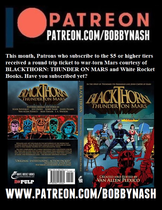 This month, Patrons who subscribe to the $5 or higher tiers received a round trip ticket to war-torn Mars courtesy of BLACKTHORN: THUNDER ON MARS and White Rocket Books. Have you subscribed yet? Each month, $5 and higher subscribers get an ebook sent to them from my published backlist. They also get first dibs on ebooks of new releases, insider info, sneak peeks at works in progress, the patreon exclusive serialized novel called SUICIDE BOMB, and more. Your subscription helps me keep writing. Please join us today at www.patreon.com/bobbynash.