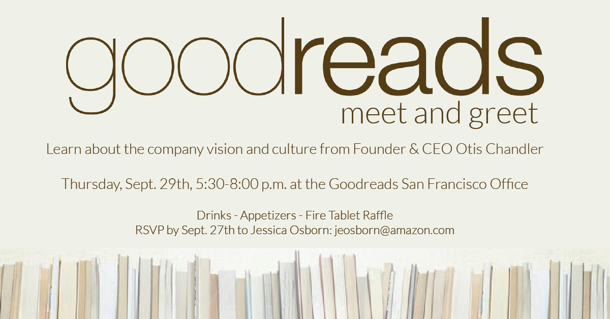Come check out the Goodreads office for a meet and greet - have drinks with some of the Goodreads team and hear a bit about what we're up to and what some of our technical challenges are. September 29th in San Francisco!