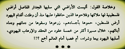 ثم يطل أحد المستعربين من صهاينة العرب ويقول هؤلاء باعوا أرضهم ولنا الحق في عمل سلام مع إسرائيل وكأن جيوش ملكه ، ملك السفلس الذي يطأه بالنعل تقف على الحدود .