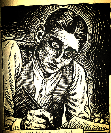 ما يميز نصوص كافكا هو أن السؤال عن حق الفرد لا يطرح نفسه فيها - كما يطرح في الروايات البوليسية - انطلاقاً من موقف ذنب ناتج عن مجرى حدث وسياق أدلة ، حيث يمكن فرضياً إجراء تحقيقات بناءً على هذا الموقف ، وإنما على العكس من ذلك يجري عرض الولادة في العالم كولادة في موقف الإستجواب ، وانطلاقاً من هذه التجربة يقوم البطل بتطوير شعوره بالذنب .