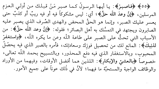 "فَاصْبِرْ إِنَّ وَعْدَ اللَّهِ حَقٌّ وَاسْتَغْفِرْ لِذَنبِكَ وَسَبِّحْ بِحَمْدِ رَبِّكَ بِالْعَشِيِّ وَالْإِبْكَارِ"