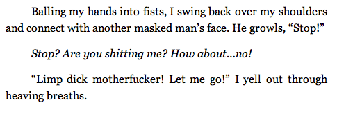 "You are not allowed thought anymore, your choices are mine, your actions are mine, everything you think or do will only be because I have allowed it… Your life depends on your submission. Do not fight against me now only to be handed over to men far more cruel that I can ever be."