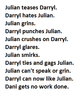 Today's writer's block is brought to you by Darryl and Julian interrupting Dani's writing process.