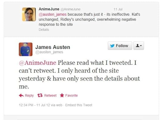Dhympna wrote: "Right. He is certainly very focussed on you and Ridley."He didn't even know about me until he saw it on the site (he flounced off of here and never saw this update), which is why I think he would have gone after Kat as soon as he learned of it if that site had actually interviewed him.