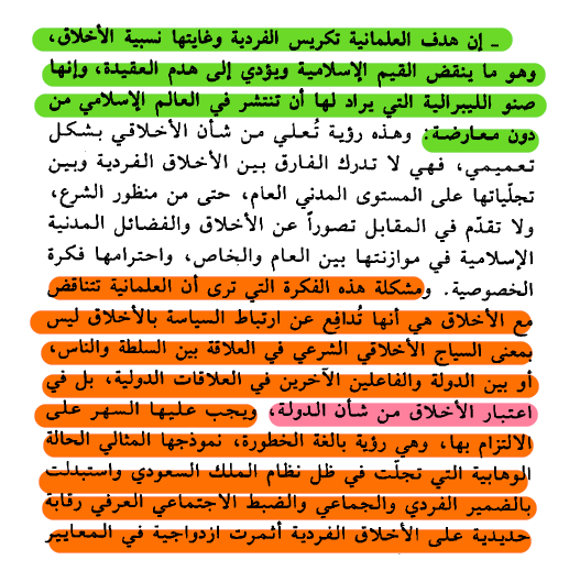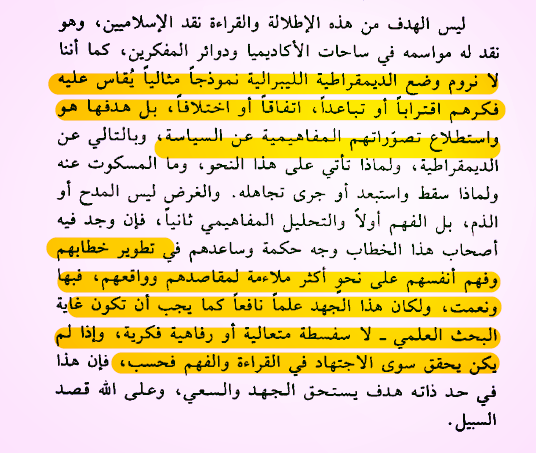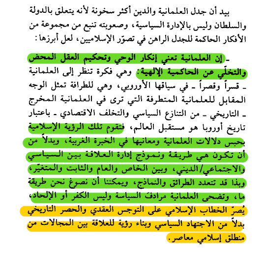 والسبيل للتقدم هو خروج الأفق النظري للإسلاميين من نفق الخوف من أسطورة وحش العلمانية واعتبار أن مقابل الدولة الإسلامية هو حتما دولة علمانية ملحدة تقضي على الإسلام ، أو تترس بثقافة تراثية من دون تجديدها خشية الإجتياح الثقافي والإبادة الحضارية ،فالبدائل أوسع بكثير ويجب الإلتفات إلى اللحظة التاريخية الفارقة في تحول مفهوم الدولة وواقع قوتها ودراسة أثره في تصورات السلطة ، ومساحات السياسة كذلك ،معنى ومبنى وسياقات ومفاهيم