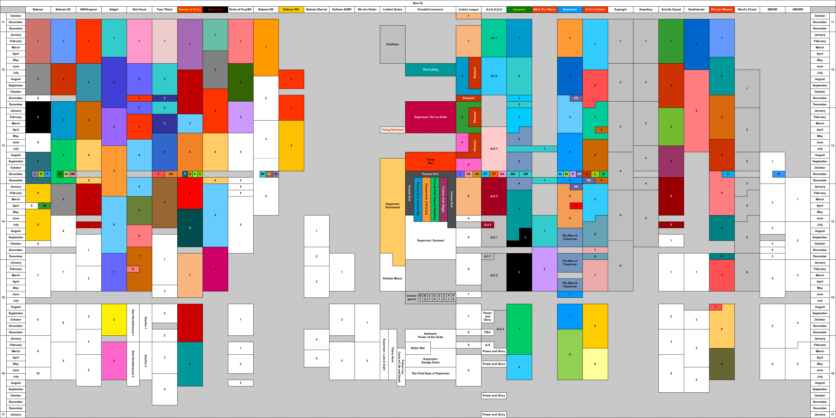 You can see it in the chart below. Batman/Superman and Superman/Wonder Woman, I intend to read but haven't started. The series in light grey (Superboy, Supergirl, World's Finest, Huntress, Convergence, etc.) are optional, so I'll probably skip a few of them if I'm really itching to get to Rebirth. I already decided to drop Futures End.