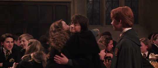 (1) "Running at Ron, [Hermione] flung [her arms] around his neck and kissed him full on the mouth. Ron ... responded with such enthusiasm that he lifted Hermione off her feet."