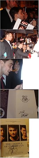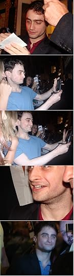 Ok so Daniel Radcliffe had the main part in a play in London called “the Cripple of the Inishmaan”. When I found out he was doing the play a few months ago while I would be in vacation in London I booked tickets immediately. So every night after the show Daniel comes out at the stage door of the theatre (the theatre’s back exit) and he signs stuff and takes photos with fans. So of course I had to go and meet him. I watched the play at last Wednesday (August 21th) at noon. (Daniel comes out only after night shows but people gather outside of the theatre from very early. So I am lucky I watched a noon performance because I could wait outside of the theatre and meet him. If I had watched a night performance I would have to go back another day and wait to meet him). So after the performance I watched ended (in which Daniel was truly spectacular) I went outside of the theatre at the back door and waited for almost 5 hours to meet him. The crowd that day though was already huge although I went there very early. At 9:30 (Dan appears around 10:30) security guys put up barriers around the door that Daniel comes out from and because of the huge crowd that day my place in front of the barriers was not that good. I was near the door but I had many people around me. BUT I still took a photo with him and he signed my Deathly Hallows book! And my sister got a signature on the theatre program about the play! :D He was so nice at that day! He was wearing a blue T-Shirt (so all the photos of him with the blue T-shirt that you see are from the first day I met him). He was so kind and he tried to sign everything and take photos with everyone! He was amazing.