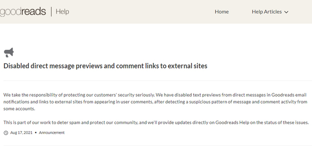 Alex wrote: "While inconvenient, phishing links has gotten out of control on goodreads so I am glad they are finally doing something."Throwing out the baby with the bathwater is indeed "something."