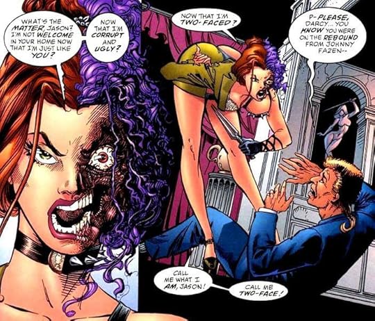 The female Two-face is a model disfigured by a rival, she wants revenge on her agent/fiance, the police should have found her as well and... look at her: