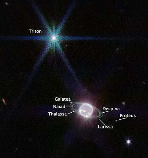 Beyond the planet itself are seven of its' 14 moons, the most significant of which is Triton, which appears star-like in the JWST's imagery: