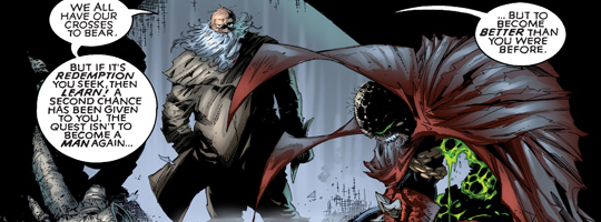(1) I don't know what's weirder, Spawn having a tantrum and overdosing on worm energy, six pages of religious philosophy and debate, or homeless gang warfare.